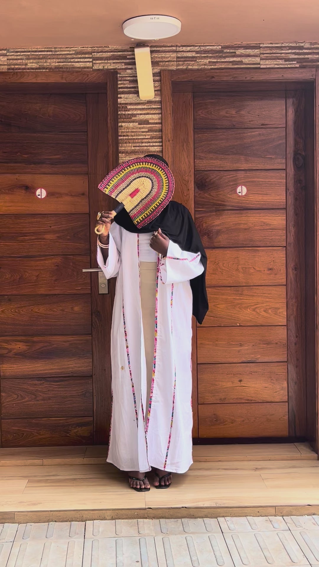 Confectionné en lin dans une coupe élégante, il dispose de poches et est rehaussé de fines bandes colorées en wax. Il vient avec une sous robe blanche en cotonnade.